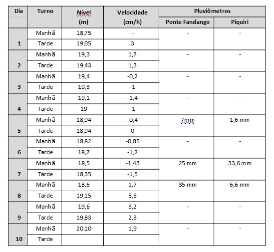 De acordo com o Plano de Contingência da Defesa Civil Municipal com 21,5 m é acionado o alerta para a comunidade para que possam ser retiradas as primeiras famílias antes da cota de 22 m quando é possível retirar os moradores de maneira preventiva antes que a água invada as residências. As medições são realizadas às 7h e as 17h, junto a Barragem da Ponte do Fandango.
